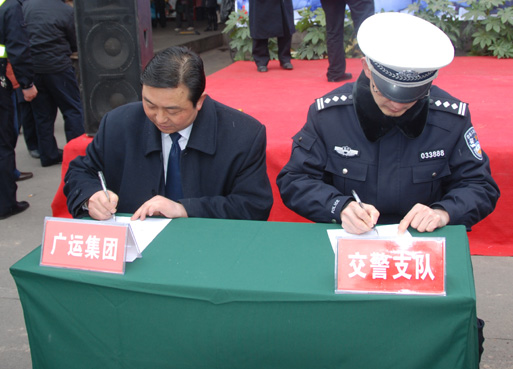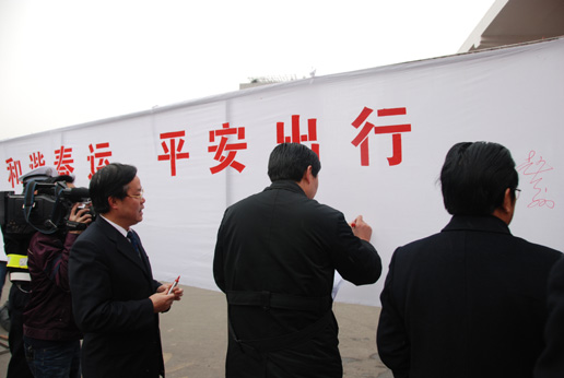 副市長(zhǎng)張康明及各部門負(fù)責(zé)人等在春運(yùn)標(biāo)語(yǔ)上簽字